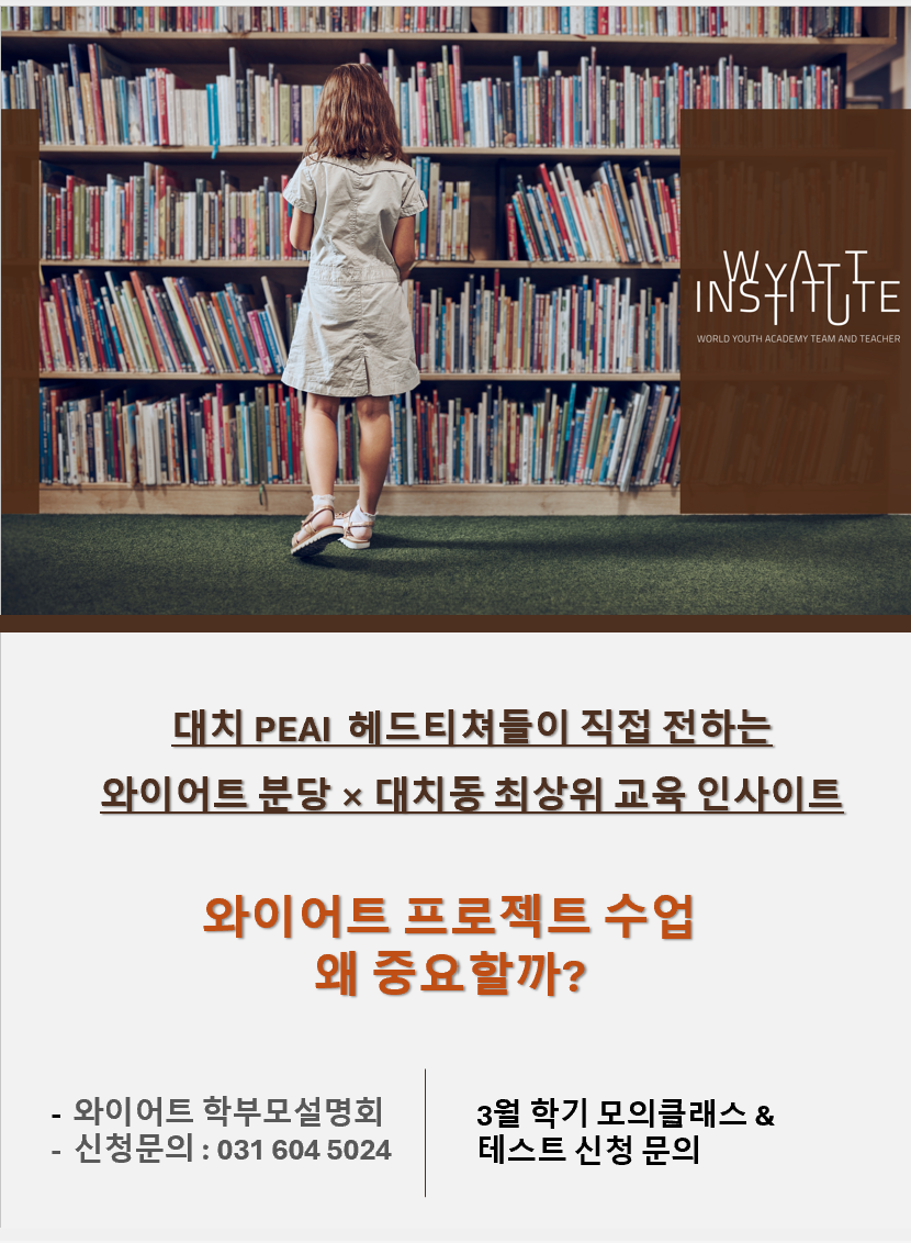 와이어트 2026 학부모 설명회 & 모의클래스 페이지 정보 작성자 관리자 댓글 0건 조회 22회 작성일 26-01-28 10:20 본문 2026년 3월 신학기 대비, 학부모 세미나를 온& 오프라인으로 진행합니다.대치 PEAI 헤드 티쳐들이 직접 전하는 2026 와이어트 분당"와이어트 프로젝트"를 통하여 유치부 프렙부터 초등연계까지 우리 아이들의 장단기 학습 로드맵을 열어드립니다. * 설명회 신청은 홈페이지가 아닌 유선으로 직접 신청하셔야 합니다. 목록 다음글2026 와이어트 교육비 안내 26.01.15 댓글목록 댓글목록 등록된 댓글이 없습니다.